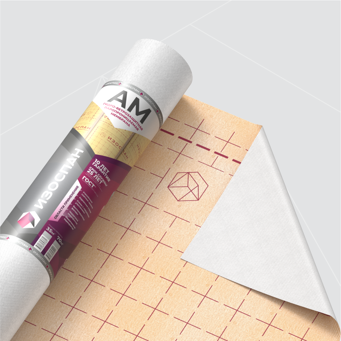 Изоспан AМ — трехслойный материал, выполненный из полимерной микропористой мембраны, усиленной с двух сторон полипропиленовым нетканым полотном.