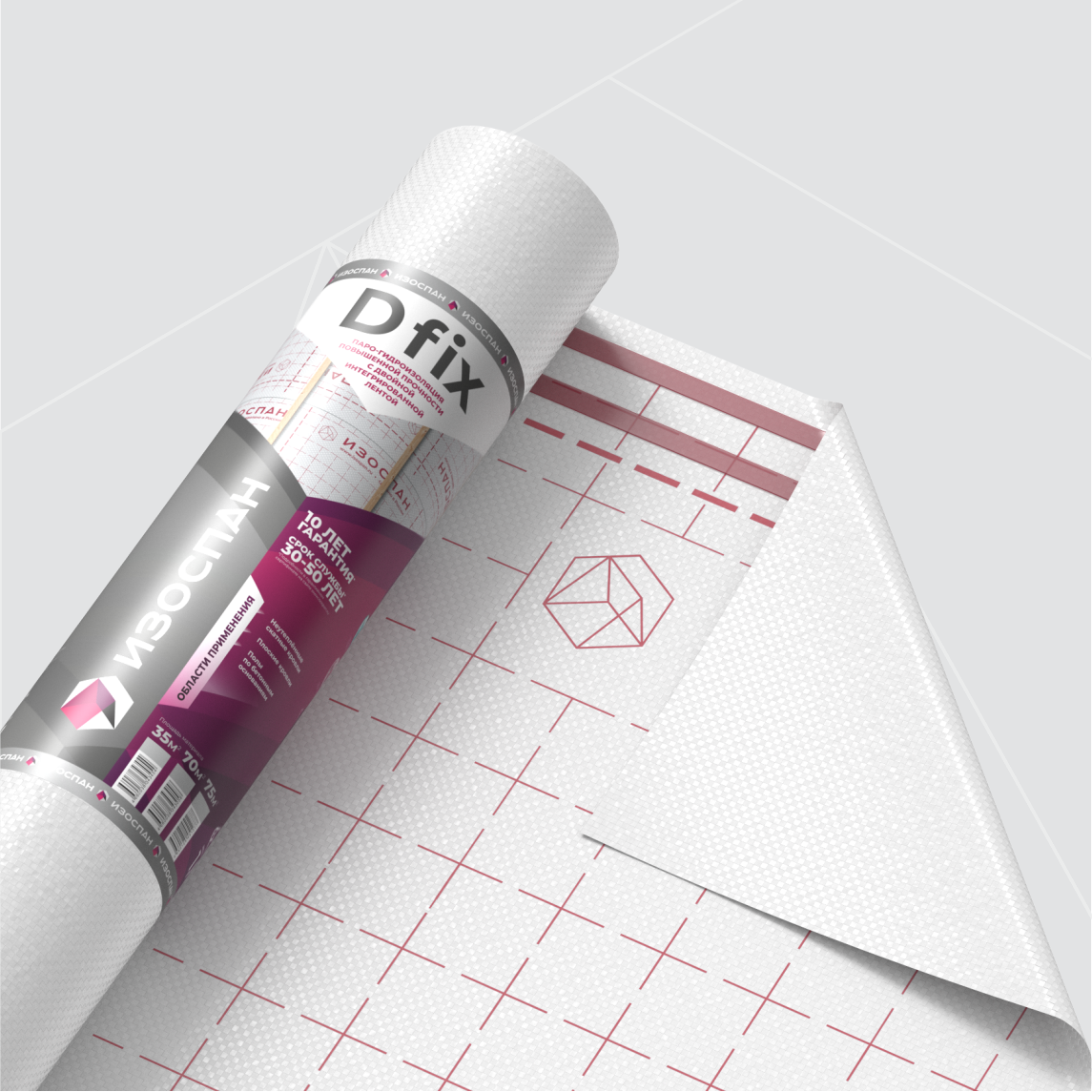 Изоспан D fix — двухслойный материал, выполненный из высокопрочного тканого полипропиленового полотна и полимерной пленки. На полотно материала нанесены две клейкие ленты, предназначенные для герметизации нахлёстов.