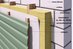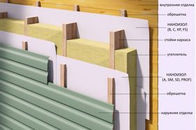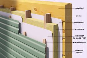 Для стен: НАНОИЗОЛ А раскатывается перпендикулярно стойкам, гладкой стороной наружу и фиксируется к ним скобами. Нахлесты между полотнами не менее 10 см. Допускается не оставлять зазор между «НАНОИЗОЛ А» и утеплителем. Нижняя кромка мембраны должна обеспечивать отвод стекающей влаги на отлив цоколя здания. В дальнейшем рекомендуется установить контробрешетку для надежного крепления материала к конструкции и обеспечения вентилируемого зазора 3-5 см. Для фиксации реек применяются гвозди или саморезы. Контр обрешетка будет основой для крепления наружной обшивки (блокхаус, сайдинг, ОСБ и т.д.).