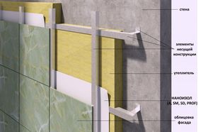 Для фасада: Сначала устанавливаются кронштейны крепления навесного фасада (в соответствии с рекомендациями производителя фасадной системы.) Затем крепятся плиты утеплителя минимальным количеством дюбелей (1-2 на плиту). Полотно «НАНОИЗОЛ А» раскатывается с натягом (без зазора) по поверхности утеплителя вертикально или горизонтально. Схема размещения полотнищ должна обеспечивать естественный сток внешней влаги, проникающей под облицовку.