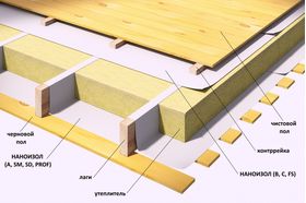 Для перекрытий: НАНОИЗОЛ А укладывается между лагами на черновой пол и огибая балки (лаги) сверху. Затем, между балок укладывается утеплитель. Если есть возможность, можно крепить «НАНОИЗОЛ А» к лагам снизу со стороны земли и укрепить рейками, которые будут служить и опорой для утеплителя. Необходимо использовать утеплитель, рекомендованный к применению в цокольных перекрытиях. Если условия эксплуатации цокольного перекрытия отклоняются от нормальных (плохая проветриваемость подпольного пространства, высокая влажность грунта под строением и т.п.), то лучше проконсультироваться у наших партнеров или представителей. Возможно, разумнее будет применить другой материал из линейки НАНОИЗОЛ.