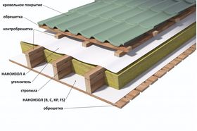 НАНОИЗОЛ А обязательно крепится контробрешеткой, она же обеспечивает верхний вентиляционный зазор. Для фиксации реек применяются гвозди или саморезы. По контробрешетке монтируется обрешетка или сплошной настил в зависимости от типа кровельного покрытия. При устройстве ендовы рекомендуется консультация специалиста.