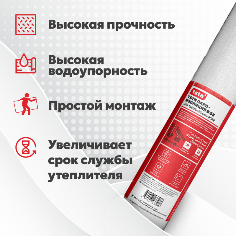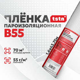 Пленка пароизоляционная TSTN B55 70 м2 Пароизоляционная пленка TSTN B55 изготовлена из полипропилена. Предназначена для защиты утеплителя от проникновения водяных паров воздуха. Такую пленку применяют изнутри в конструкциях утепленных скатных кровель, каркасных стенах и перекрытиях.