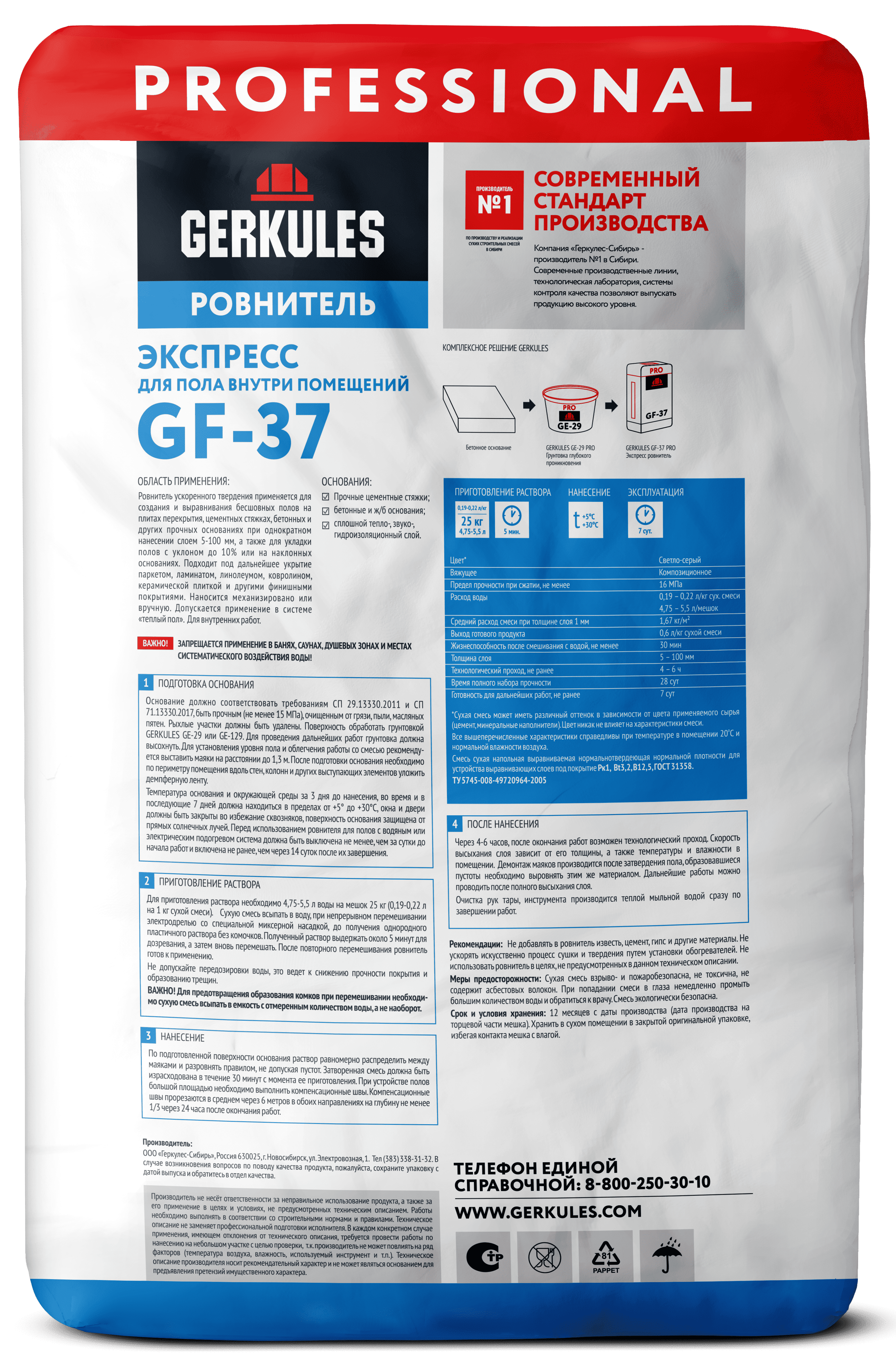 Основание должно соответствовать требованиям СП 29.13330.2011 и СП 71.13330.2017, быть прочным (не менее 15 МПа), очищенным от грязи, пыли, масляных пятен. Рыхлые участки должны быть удалены. Поверхность обработать грунтовкой GERKULES GE-29 или GE-129. Для проведения дальнейших работ грунтовка должна высохнуть. Для установления уровня пола и облегчения работы со смесью рекомендуется выставить маяки на расстоянии до 1,3 м. После подготовки основания необходимо по периметру помещения вдоль стен, колонн и других выступающих элементов уложить демпферную ленту.